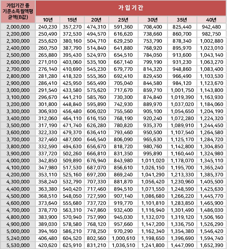 기본연금액 = A값 × 소득대체율 × (가입연수 / 40)